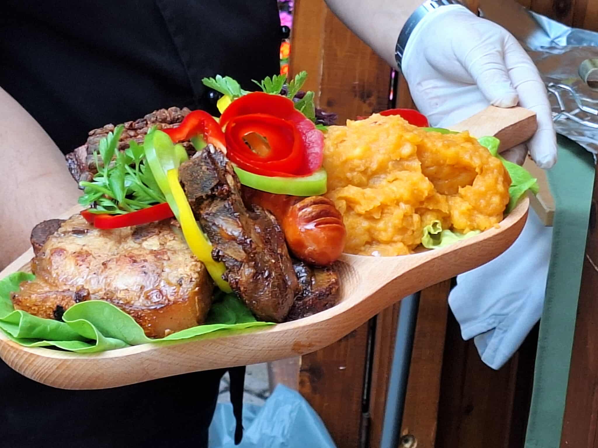 A menü: Jókai bableves, füstölt húsos kukoricadarás töltött káposzta, ropogós malacsült, párolt vöröskáposzta, hagymás tört burgonya, a desszert: szilvalekváros hájas volt.