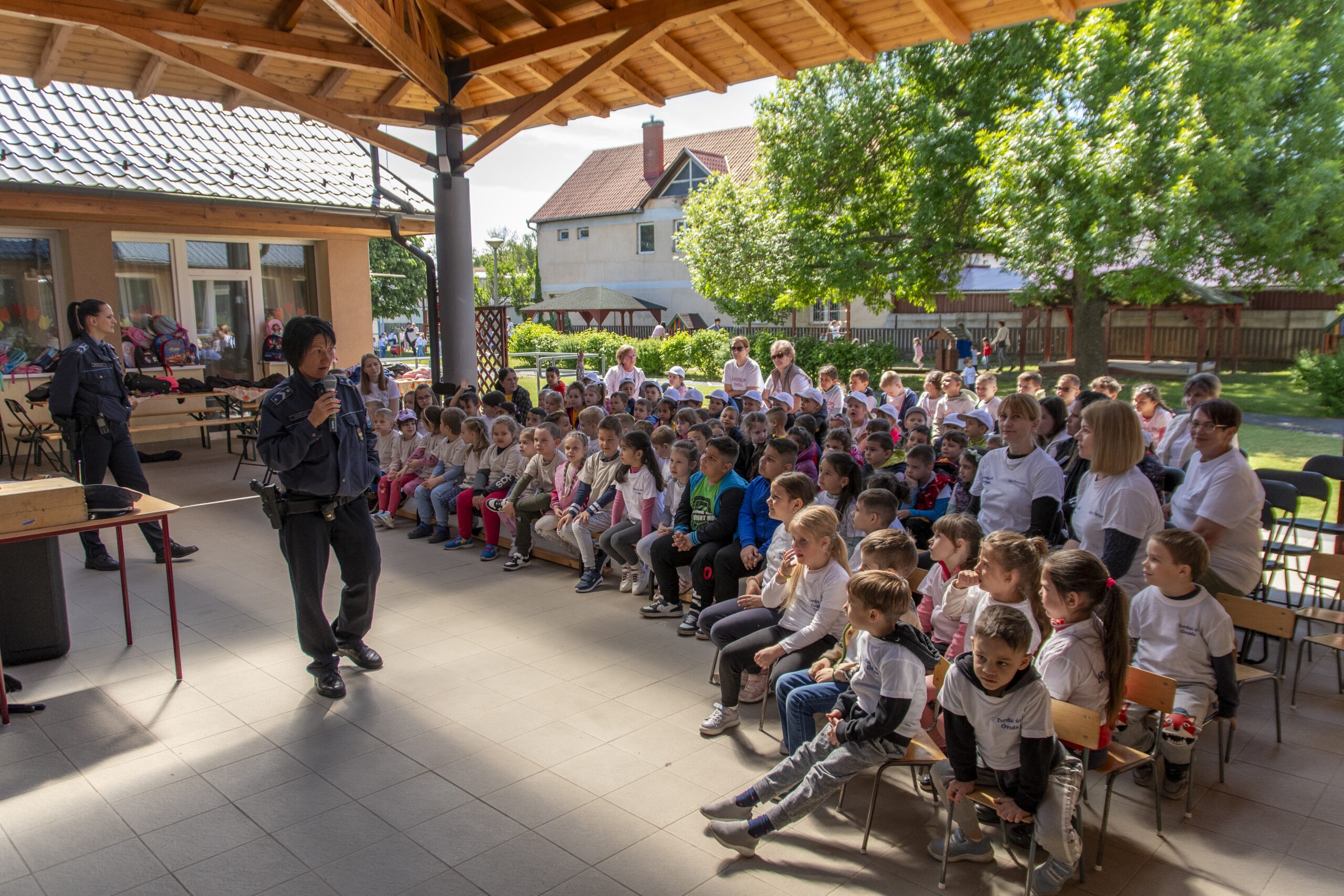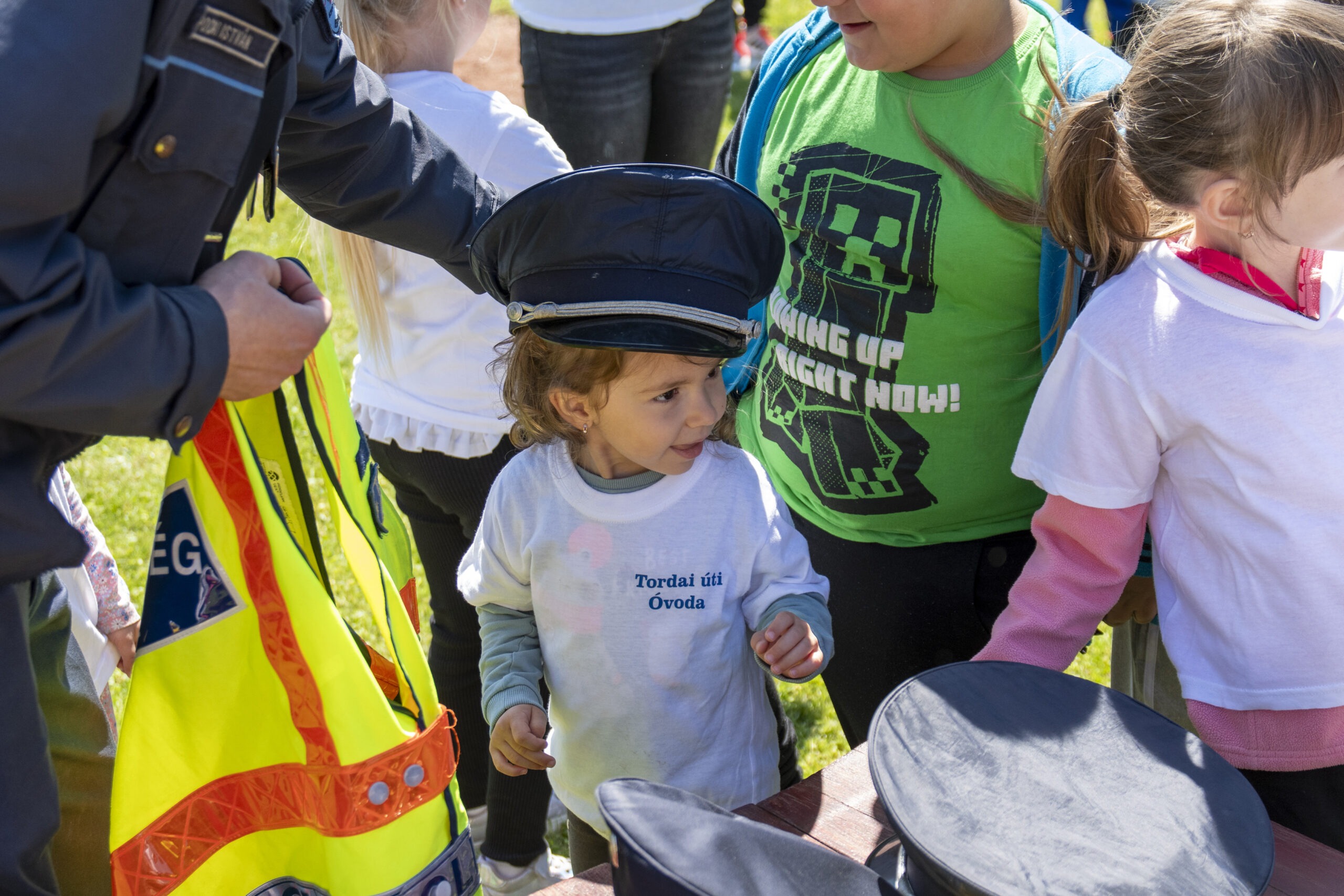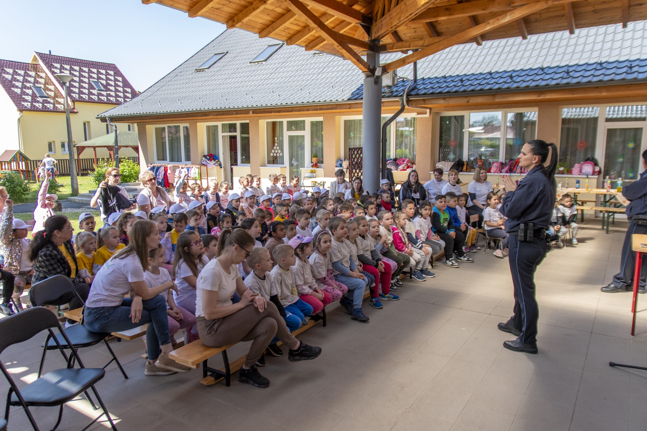 A délelőtt folyamán, az Ovizsaru program keretében sor került az eddigi ismeretek összegzésére, mely során tudatosult a gyermekekben, hogy 1-1 veszélyes helyzetekben kihez fordulhatnak, hiszen a rendőrök szolgálnak és védenek. Természetesen a kisebbek sem maradtak élmény nélkül. Ujjlenyomat, tenyérnyomat készült a vállalkozó kedvűeknek, illetve a különböző kellékeket is felpróbálhatták. Minden gyermek számára élmény jelentett, hogy beülhettek a rendőrautóba is. Ezúton is hálásan köszönjük a Kisvárdai Rendőrkapitányság dolgozóinak a kreatív, támogató együttműködést.