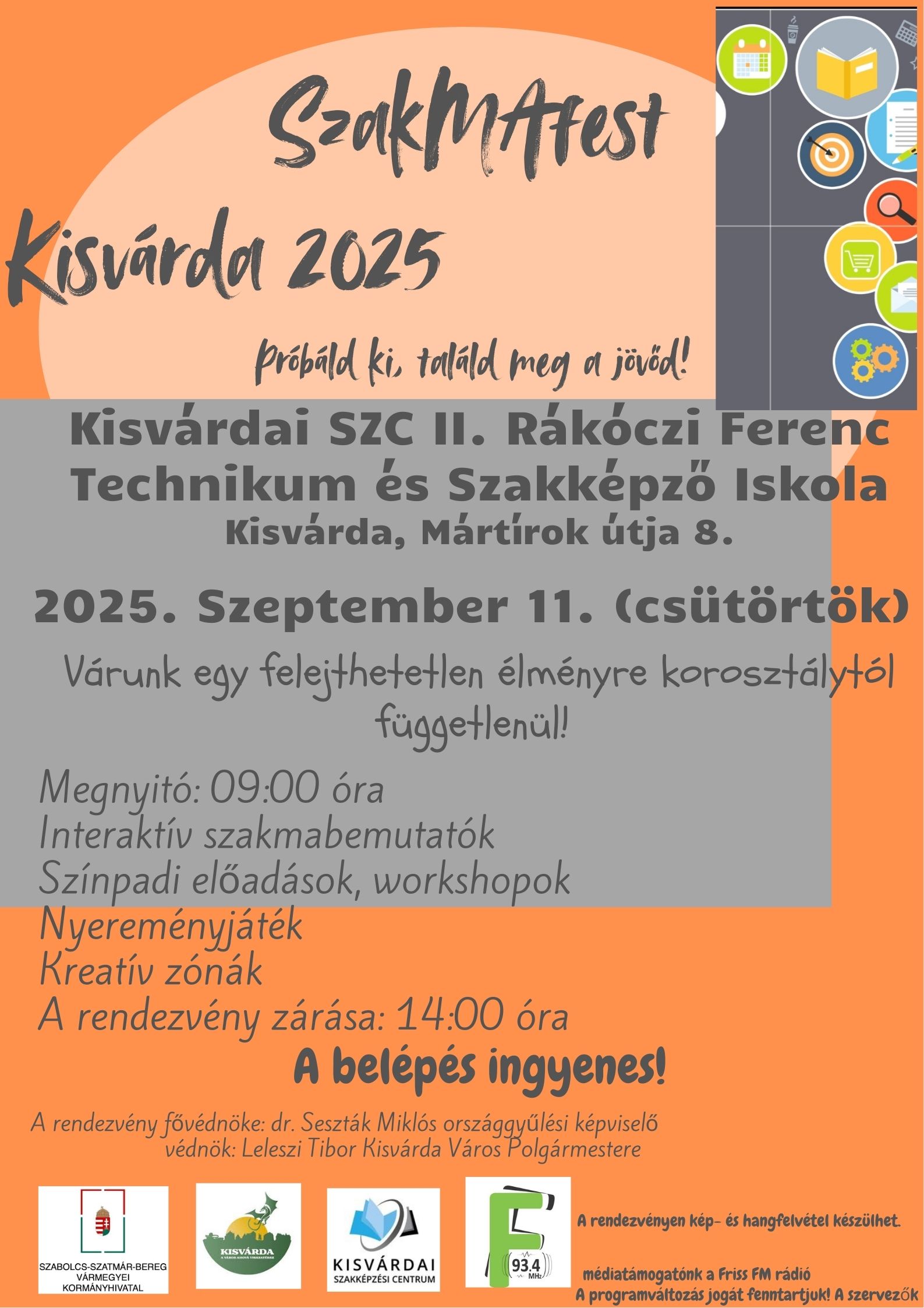 Akkor ott a helyed a szakMAfesten, szeptember 11-én, 09.00 és 14.00 óra között Kisvárdán, a Kisvárdai SZC II. Rákóczi Ferenc Technikum és Szakképző Iskolában!
