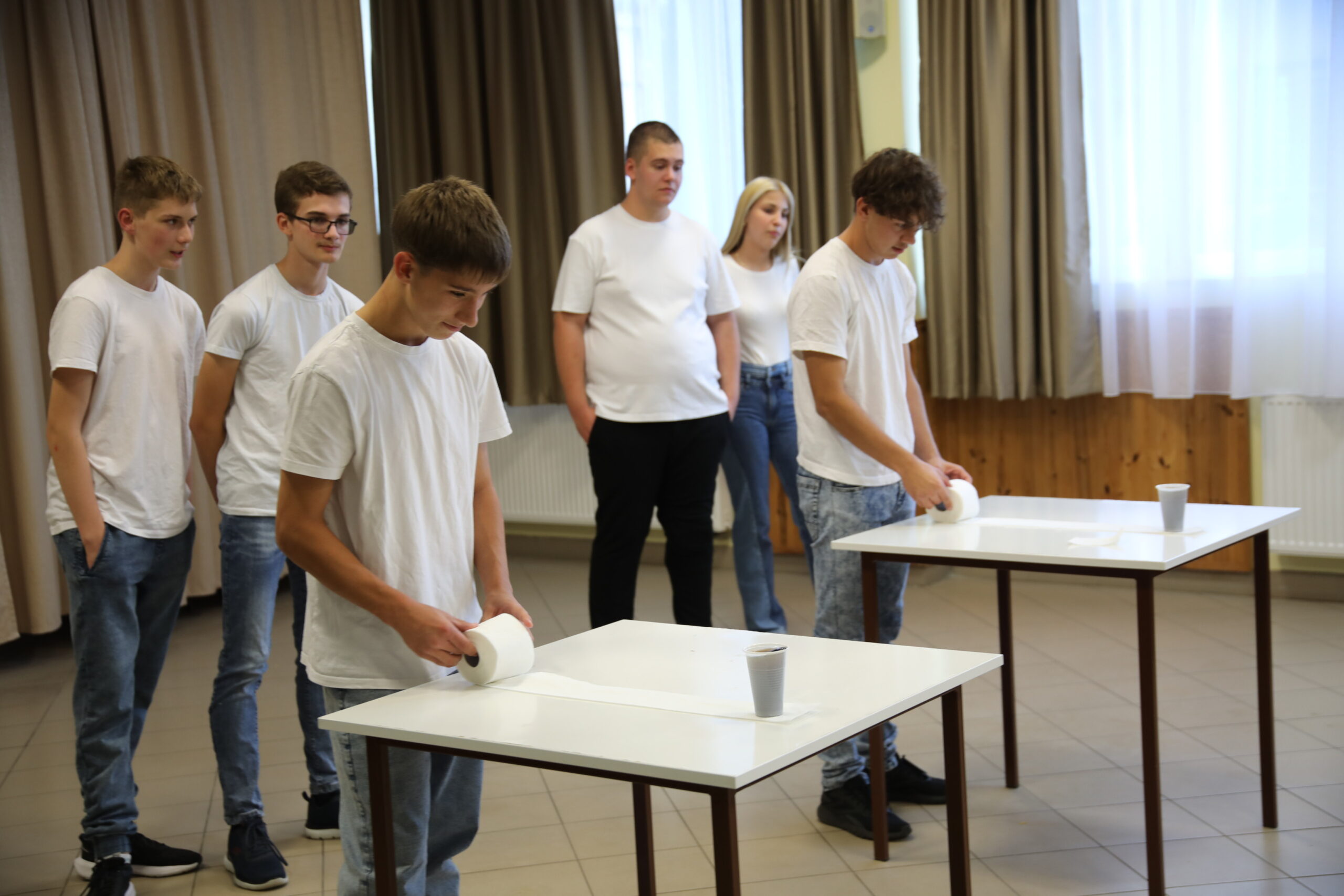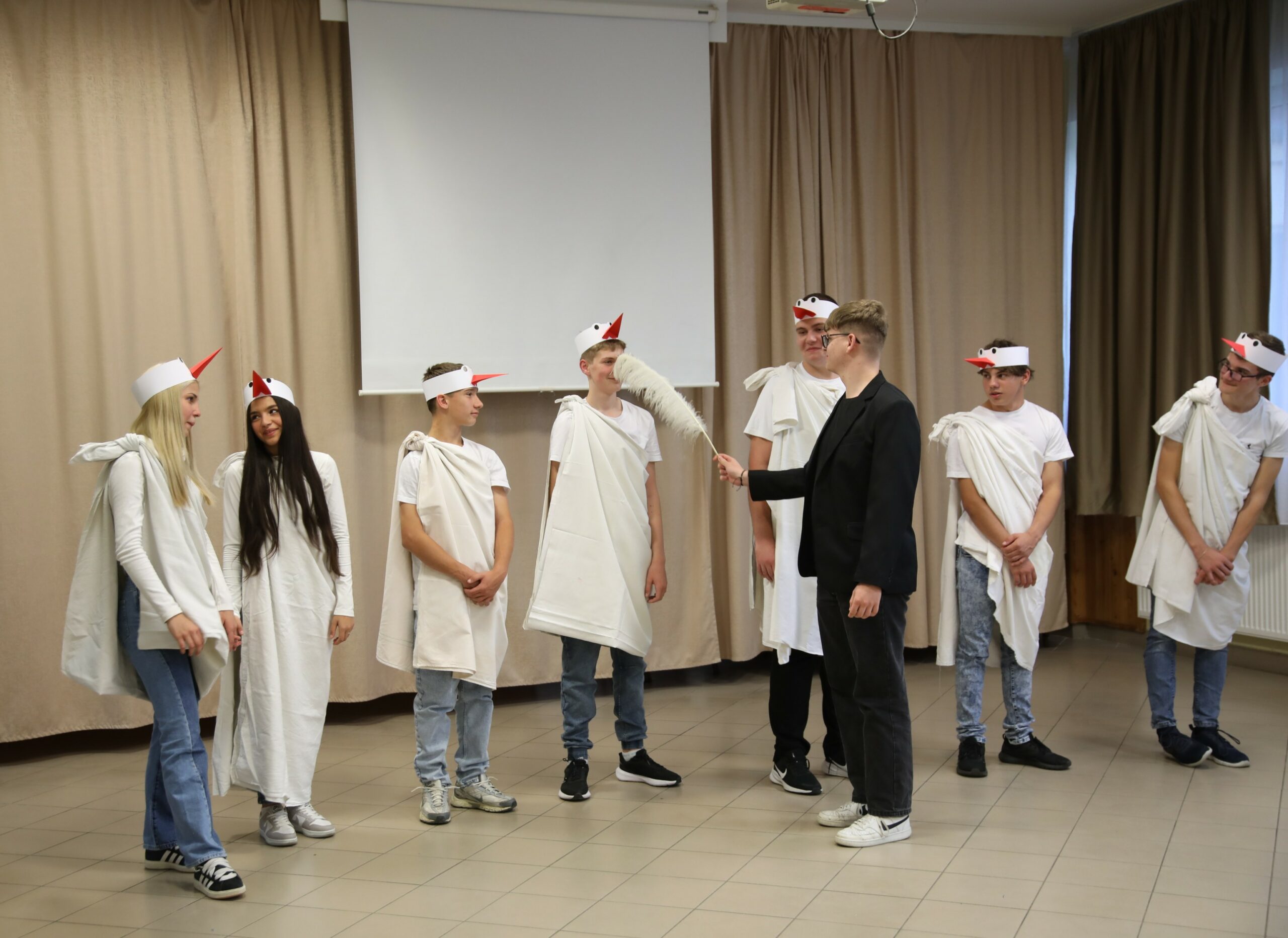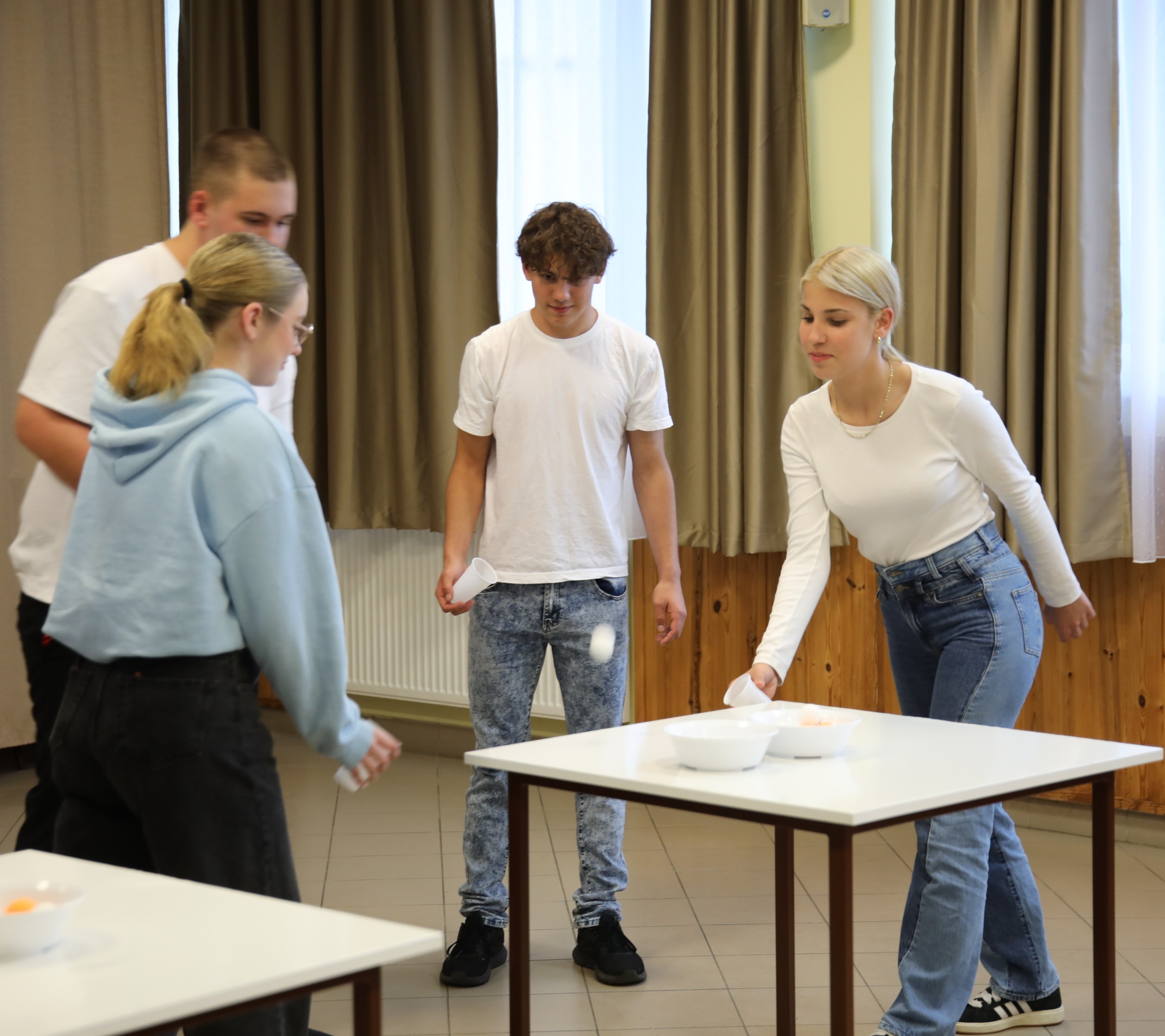 Ezt követően a fürge lábú fiúk táncelőadása színesítette a programot, akik lendületes, jókedvű produkciójukkal pillanatok alatt elvarázsolták a közönséget. A táncot hangos taps és nevetés kísérte – a diákok bebizonyították, hogy a humor és a mozgás öröme kéz a kézben járhat. A DÖK diákjai ezután játékos ügyességi feladatokkal tették próbára a gólyákat. A két csapat lelkes küzdelme jókedvű versengéssé alakult, ahol nem a győzelem, hanem a közös élmény számított igazán.