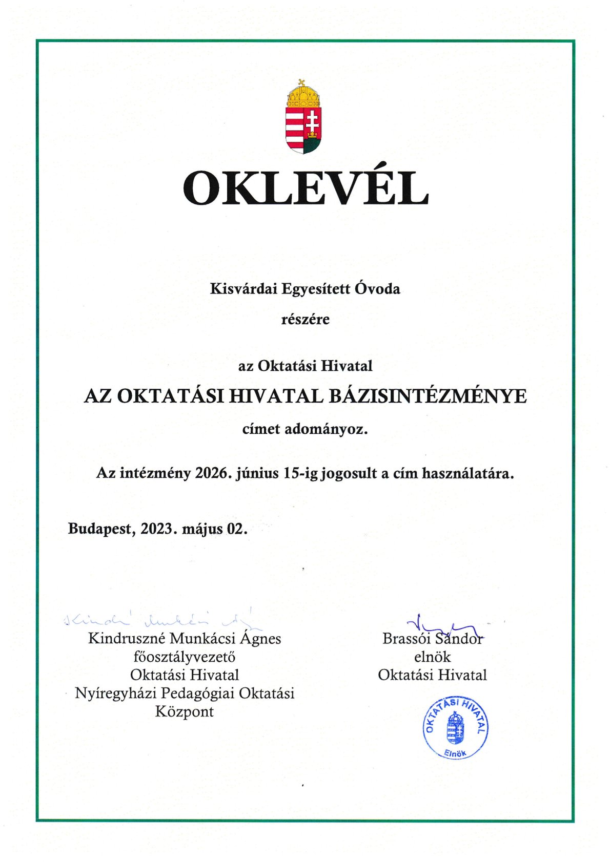 A Pedagógiai Oktatási Központ és a bíráló bizottság javaslatai alapján az Oktatási Hivatal köznevelési elnökhelyettese a rendkívül magas szakmai színvonalú pályamunkák közül a A Kisvárdai Egyesített Óvoda valamennyi feladatellátási helyét érdemesnek ítélte Az Oktatási Hivatal Bázisintézménye cím viselésére.