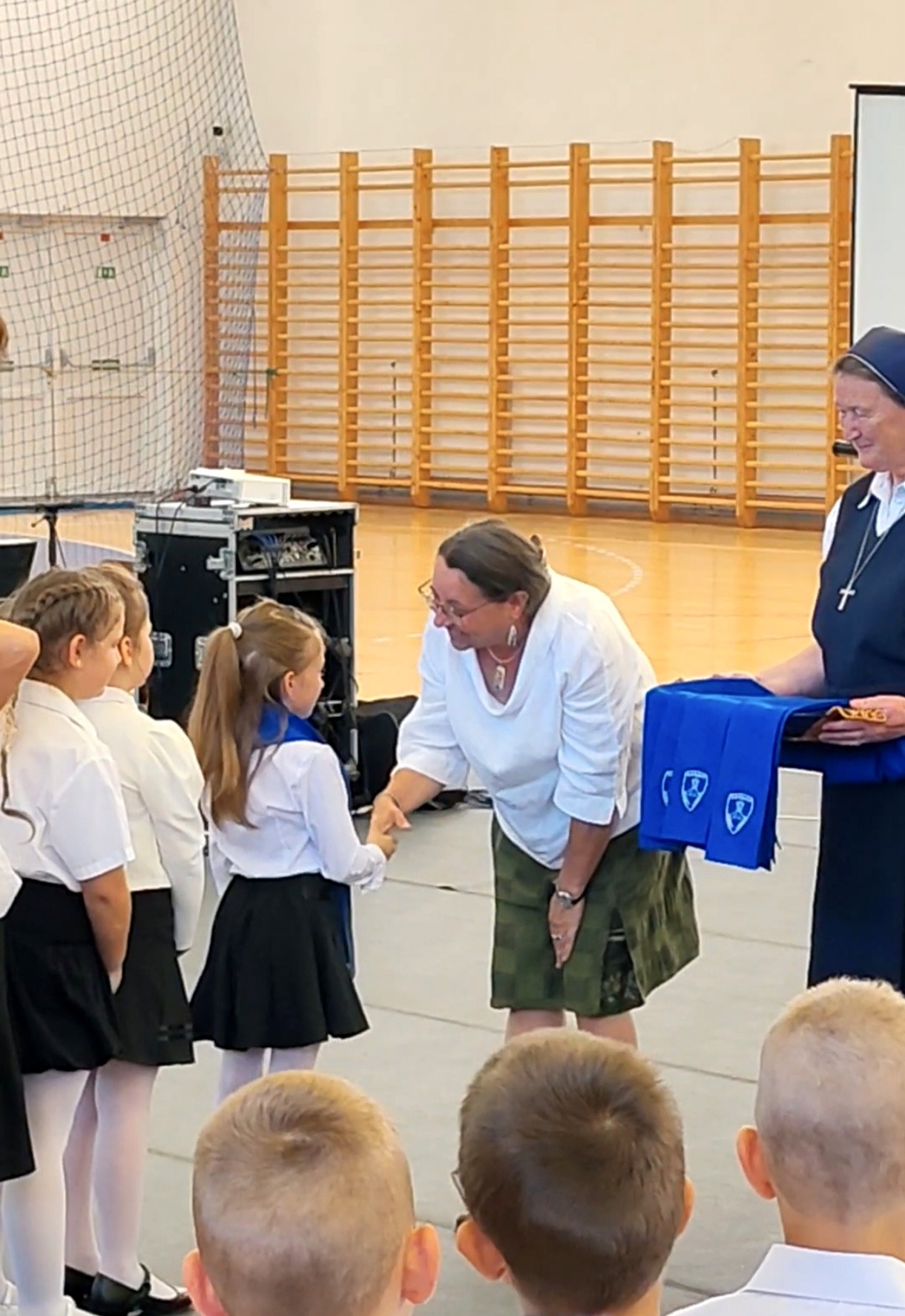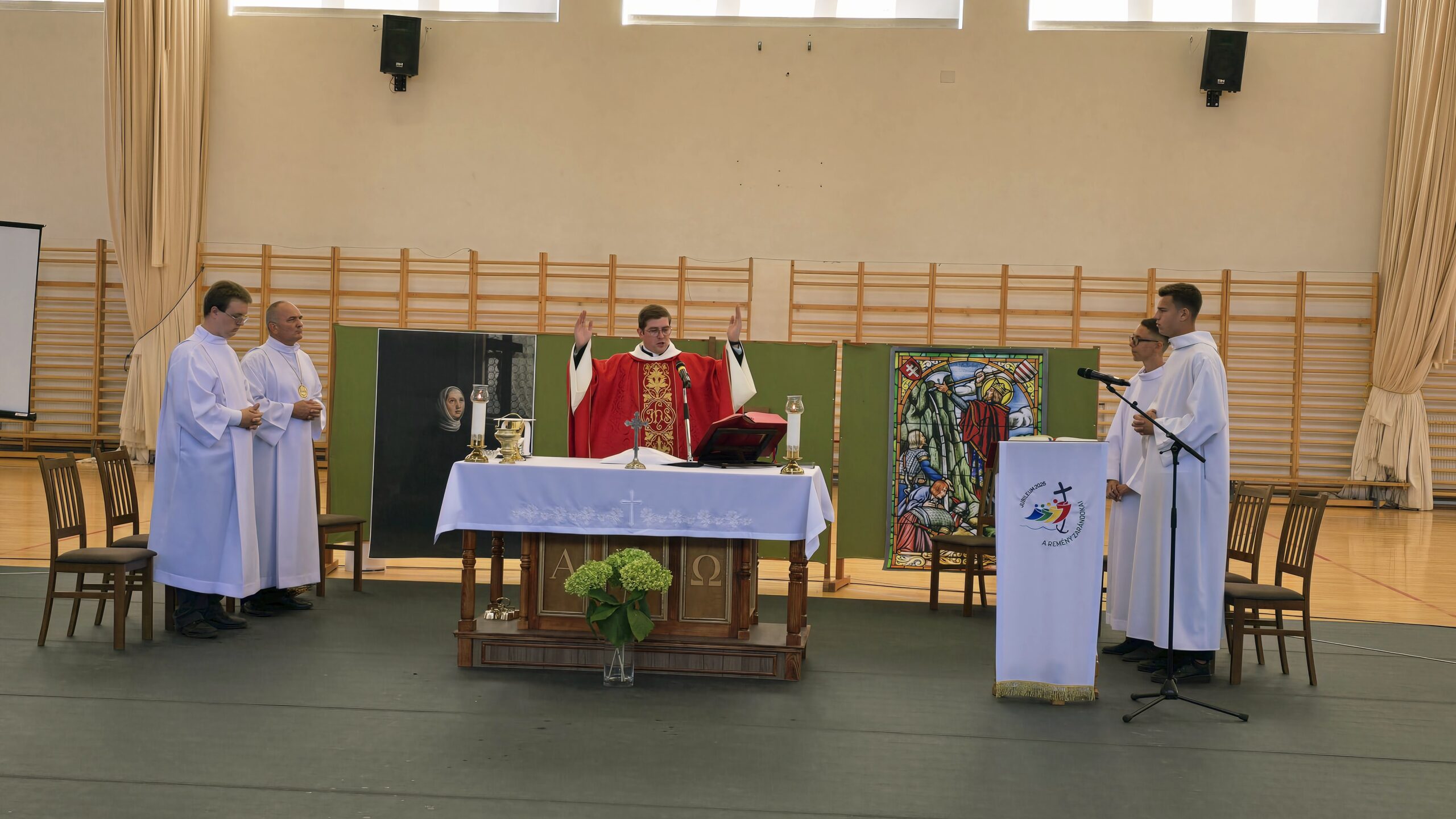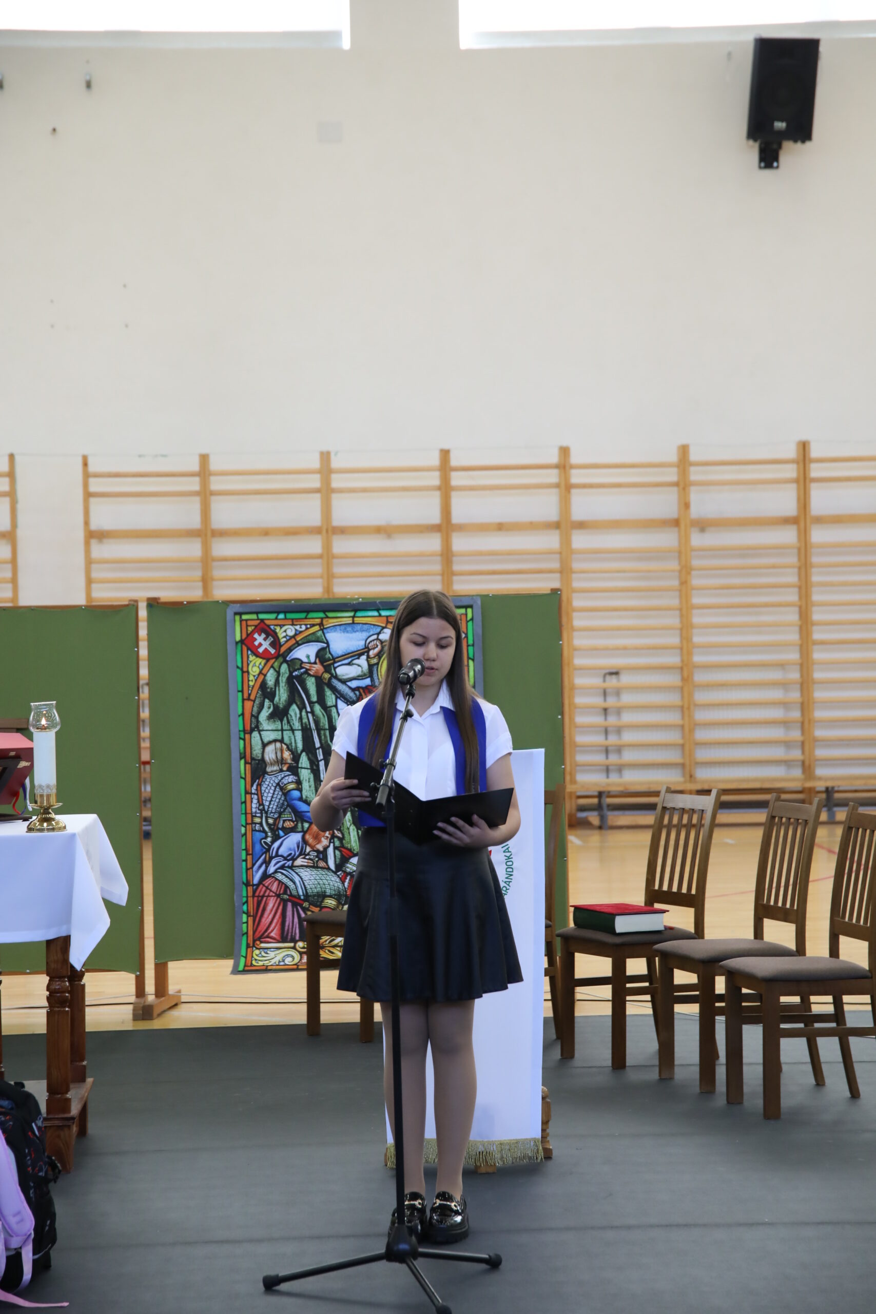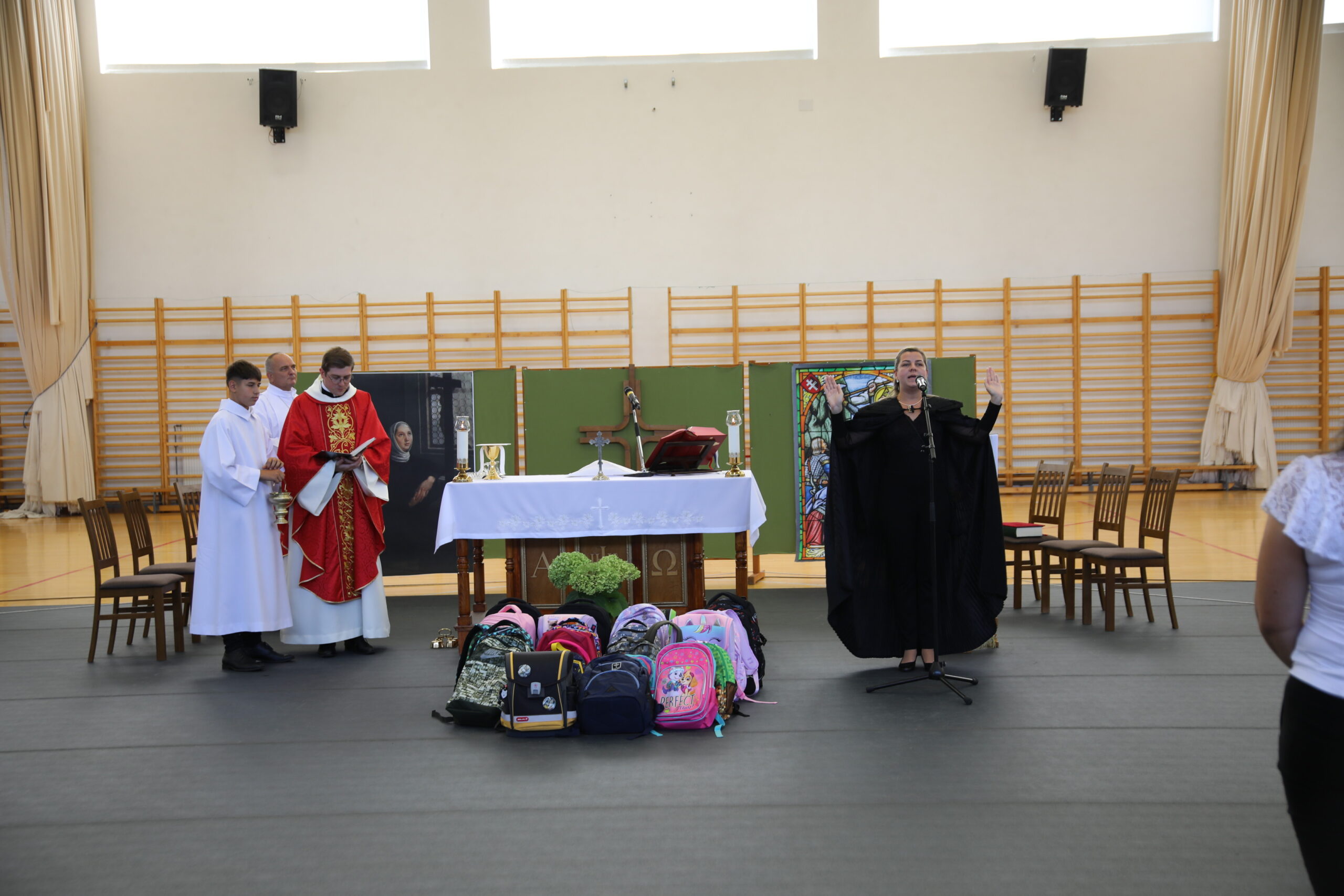 Ervin atya imádságaiban különös figyelemmel hordozta a diákokat, pedagógusokat és szülőket. Az oltárnál felhangzó könyörgések és énekek mind azt a közös szándékot fejezték ki, hogy Isten segítségével és oltalmával végezhessük munkánkat. A szentmise kiemelkedő pillanata volt elsőseink ünnepélyes „befogadása”: Ervin atya megáldotta a szentlászlós közösséghez való tartozás jelképeit, a sálakat és a nyakkendőket. A gyermekek ezentúl büszkén viselhetik összetartozásunk jelét.