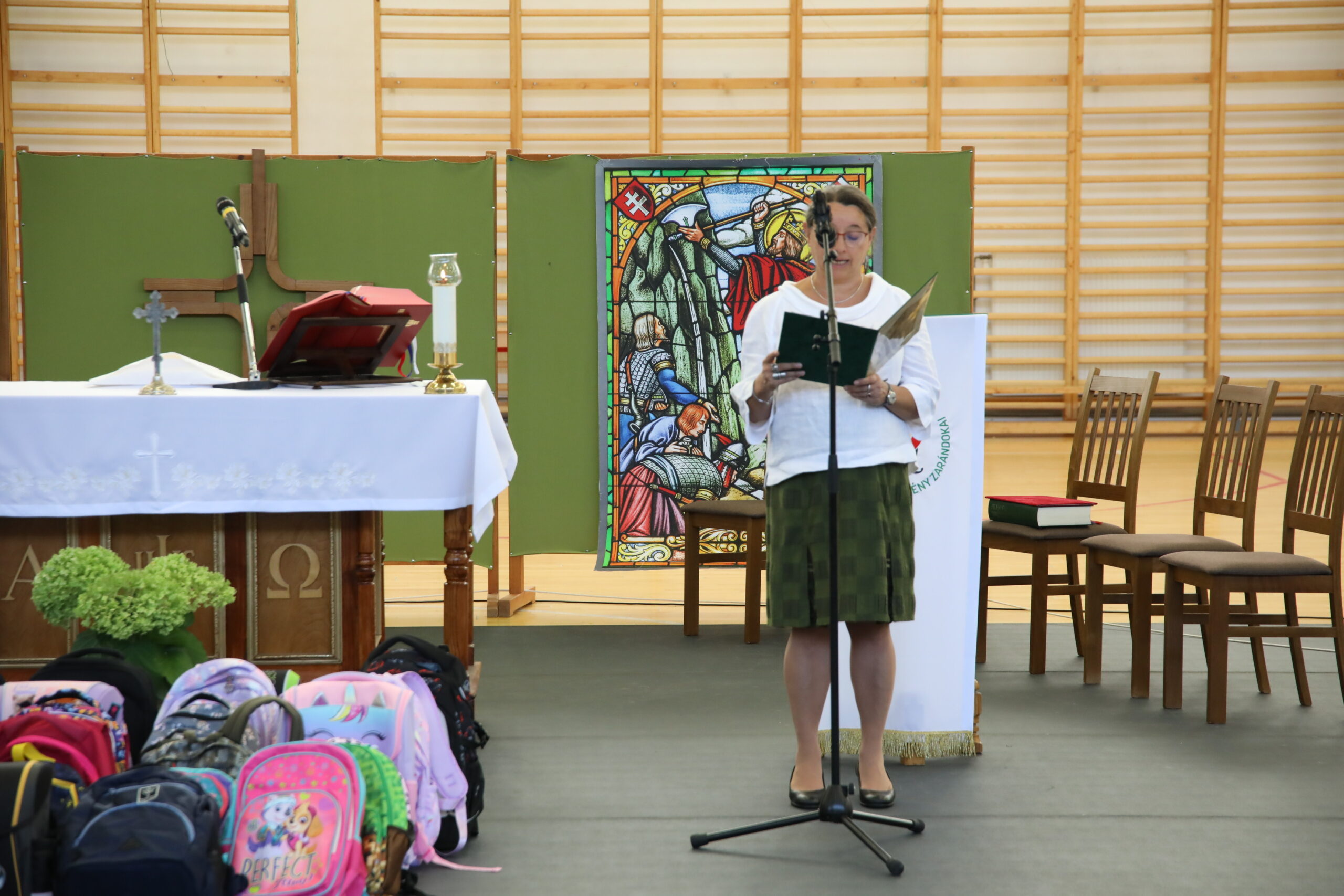 A liturgia végén főigazgató asszony ünnepi köszöntőjében Örökös Ökoiskolához, Teremtésvédő intézményhez méltóan meghívta közösségünket, hogy vegyünk részt a szeptember 1-től október 4-ig (Szent Ferenc ünnepe) tartó „Teremtés ideje” elnevezésű ökumenikus kezdeményezésben, hogy imával, jó akarattal, konkrét cselekvéssel tegyük érzékelhetővé „Isten simogatását” a világban. Útravaló gondolataival hivatalosan is megnyitotta a tanévet. Ezt követően Ervin atya és Enyedi Beáta református lelkész megáldotta a tanévet és az iskola közösségét.